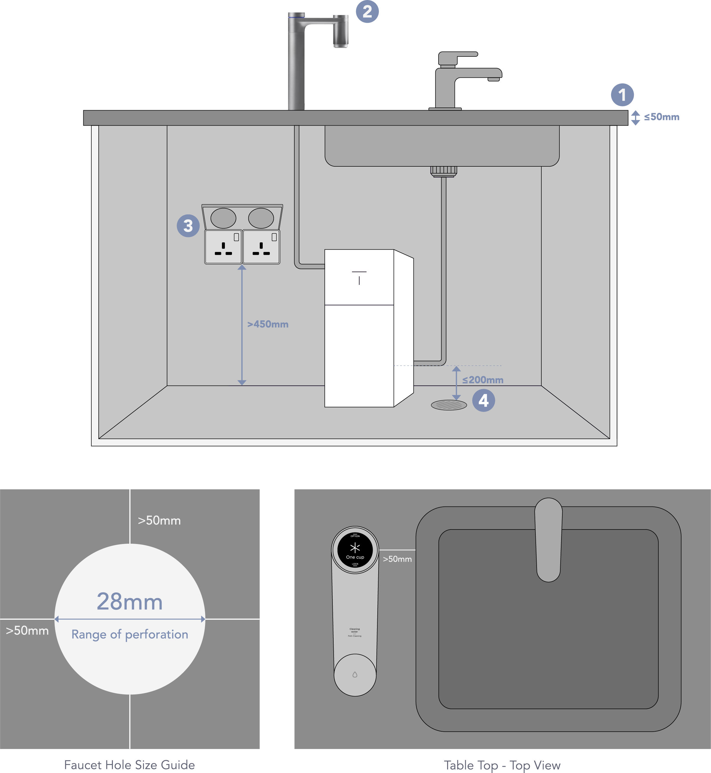 Hole for faucet should be 28mm in diameter and at least 50mm from the sink.